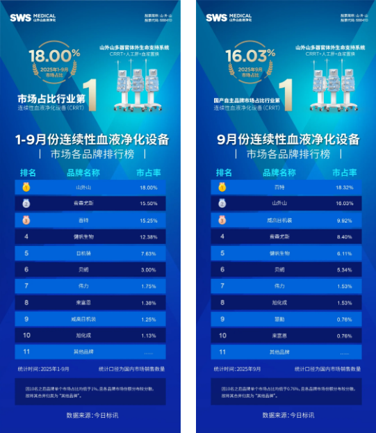 在连续性血液净化设备(CRRT)领域,山外山则持续巩固领先优势。2025年1-9 月,山外山连续性血液净化设备以18%的市场份额持续占据全行业第一;2025年9月单月,该产品市场份额为16.03%,位列国产自主品牌行业第一。